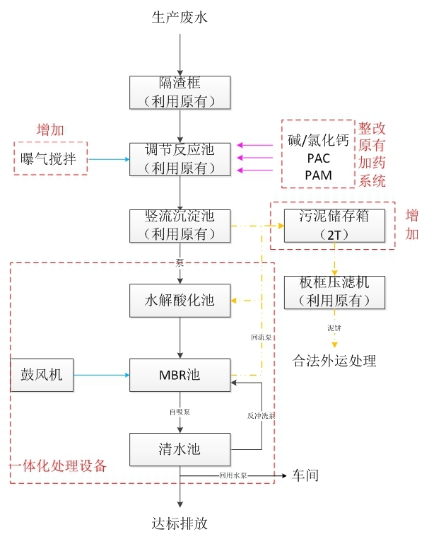 針對(duì)生產(chǎn)廢水特性:本工藝采用“混凝沉淀+水解酸化+好氧兼MBR”進(jìn)行治理,確保廢水達(dá)標(biāo)排放。