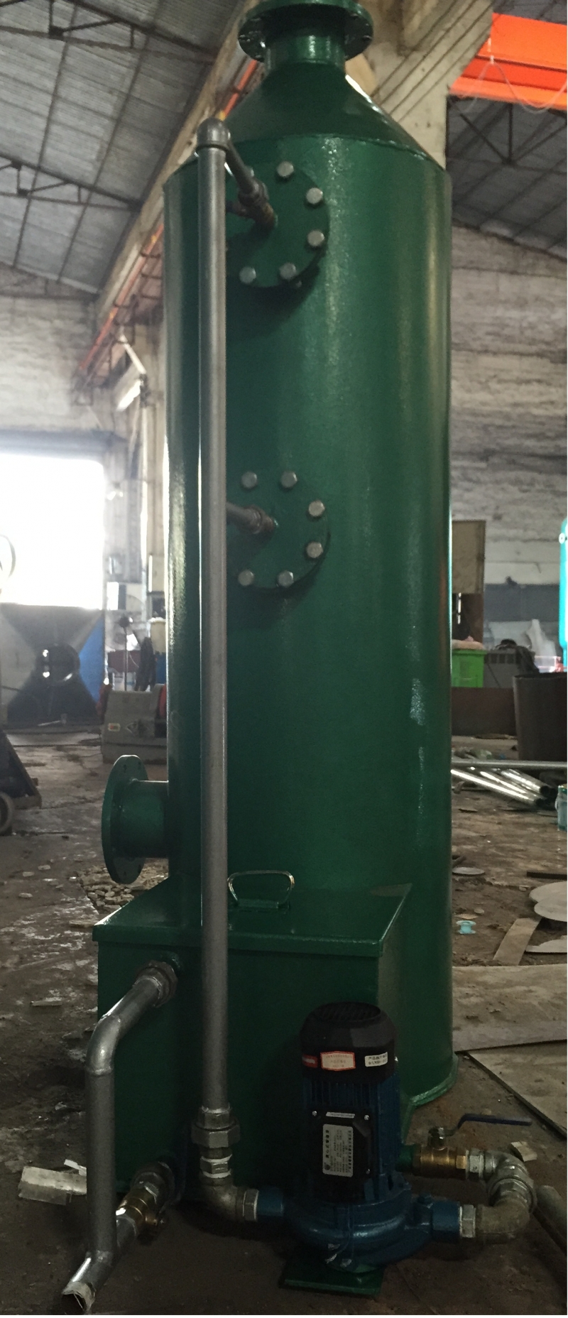 廢氣由風(fēng)管引入凈化塔,經(jīng)過填料層,廢氣與吸收液進(jìn)行氣液兩相充分接觸吸收反應(yīng),廢氣經(jīng)過凈化后,再經(jīng)除霧板脫水除霧后由風(fēng)機(jī)排入大氣。吸收液在塔底經(jīng)水泵增壓后在塔頂噴淋而下,最后回流至塔底循環(huán)使用。